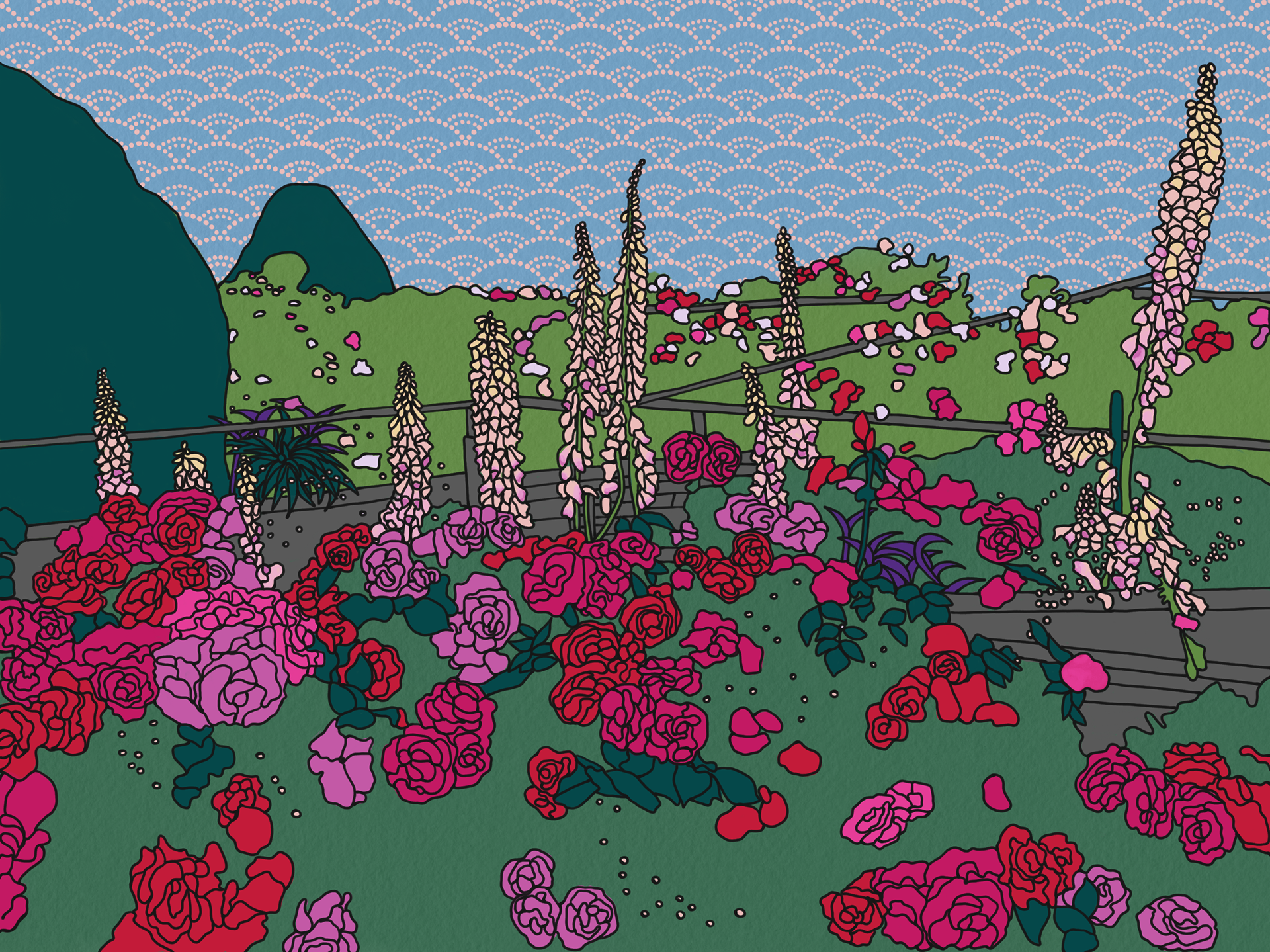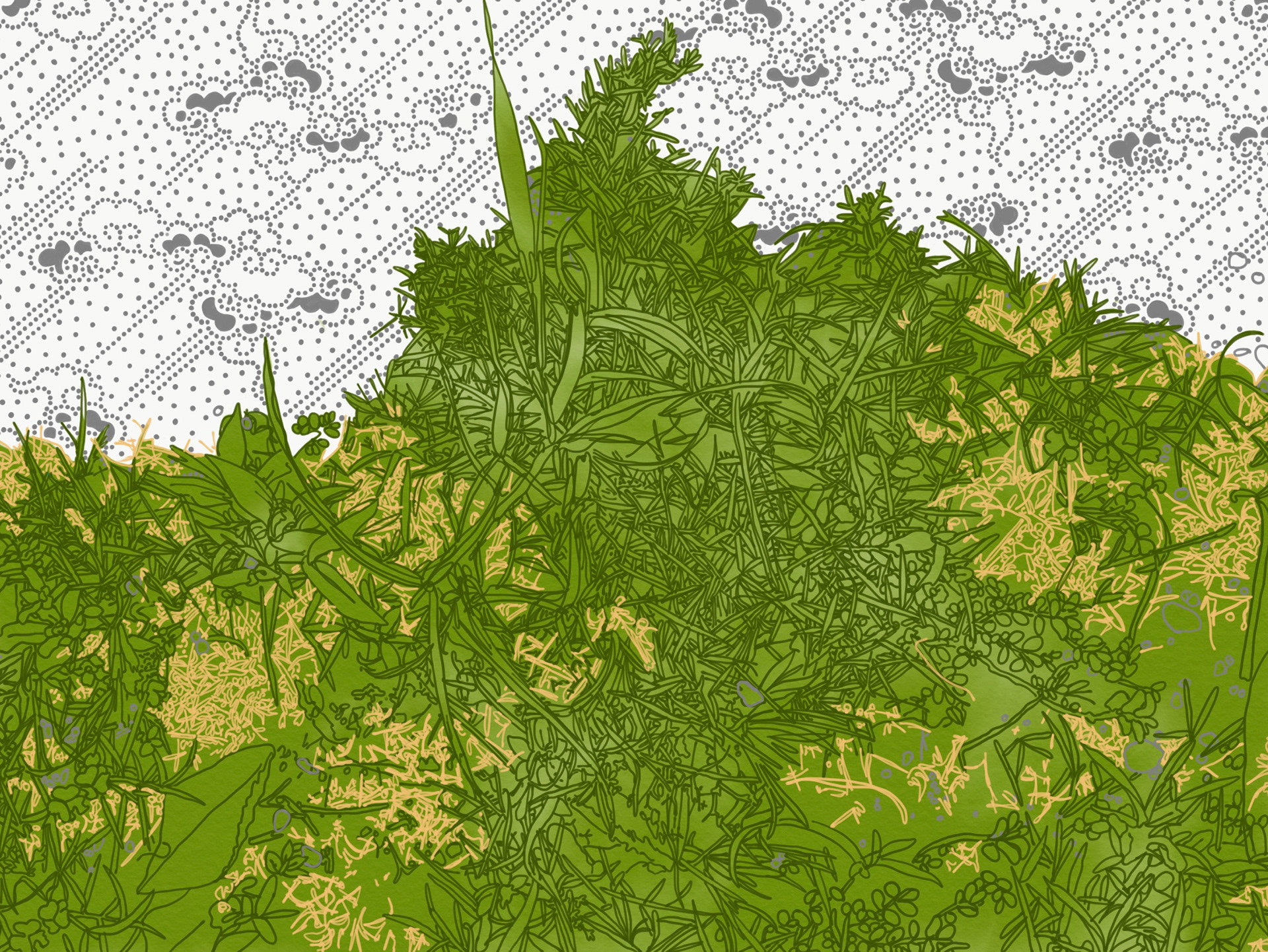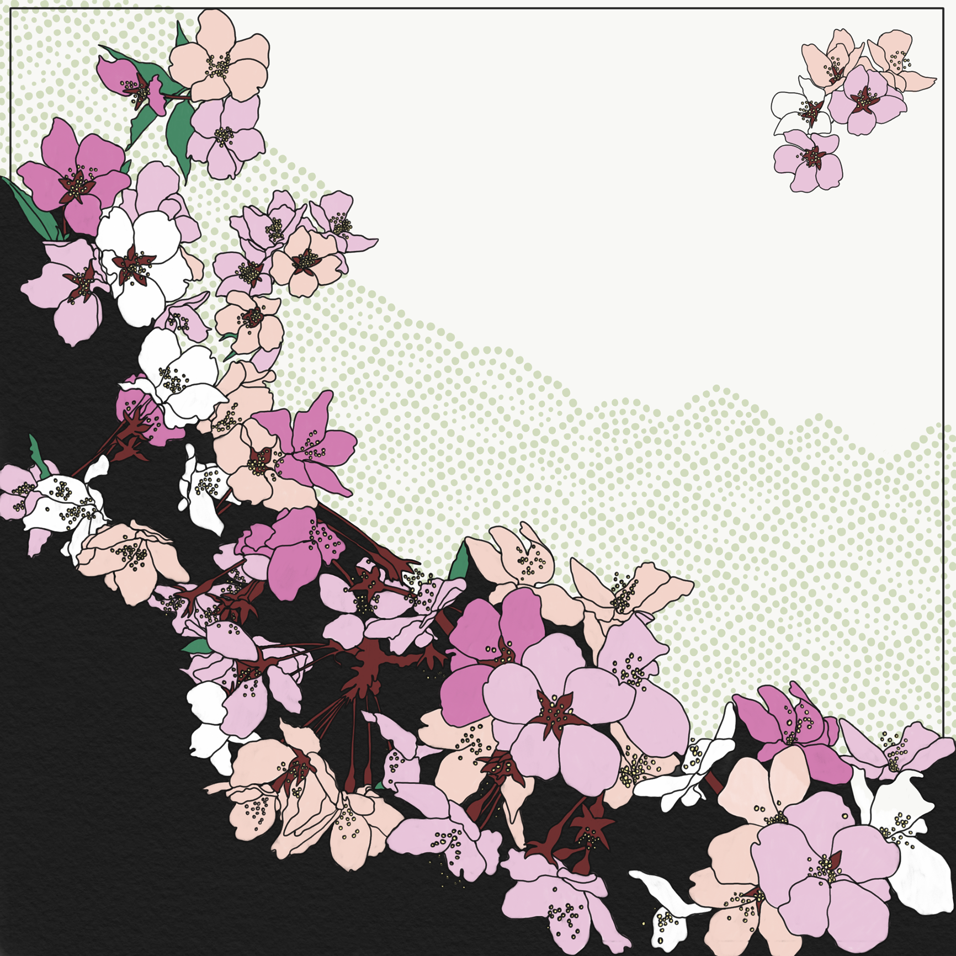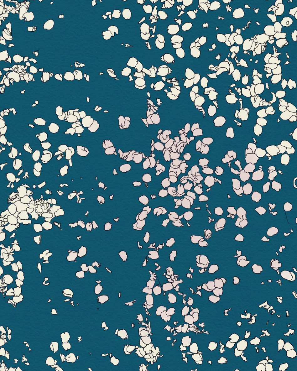 Illustrations from Naka-ku and Yamate-cho, Yokohama. These digital illustrations are drawn from close observation in Yokohama, tracing encounters with gardens, streets, seasonal plants, and moments of growth and decay. Working in a flattened, graphic language shaped in part by commissioned and commercial illustration, the works draw on Japanese visual traditions such as washi patterns, scattered compositions, and the balance between repetition and pause. Natural forms are abstracted into drifting clusters and rhythmic lines, echoing movement rather than description, and inviting the eye to wander through the image.