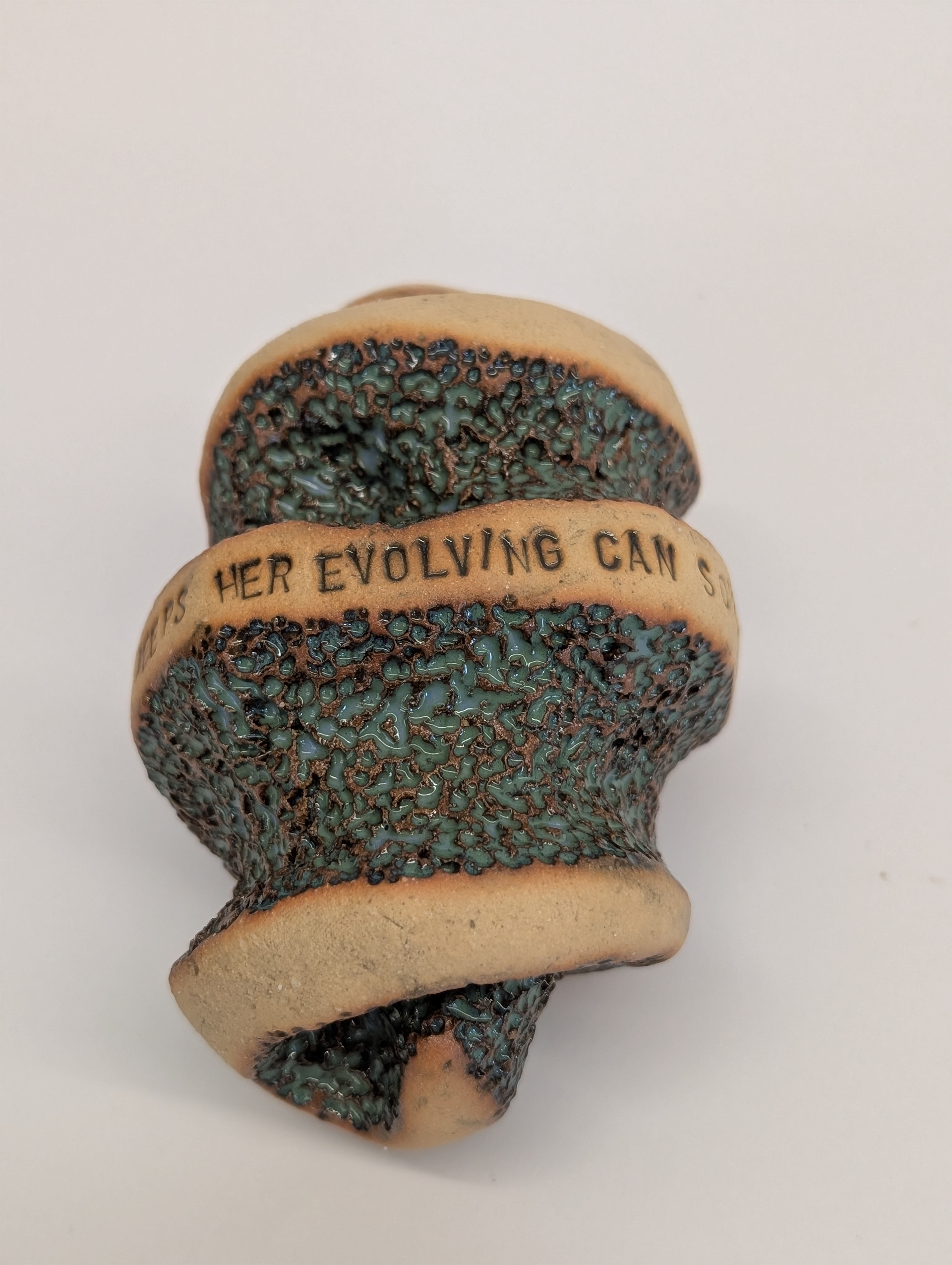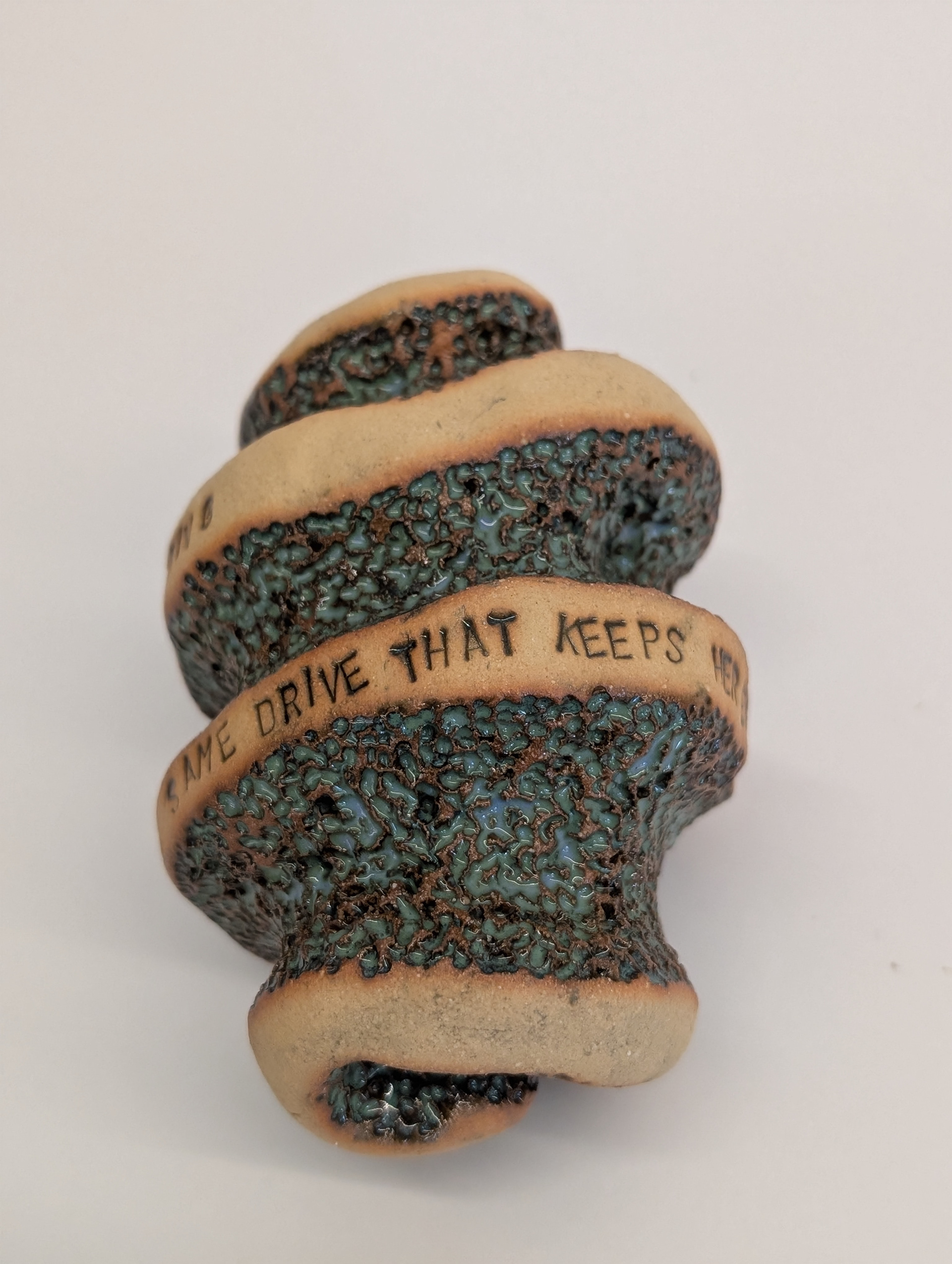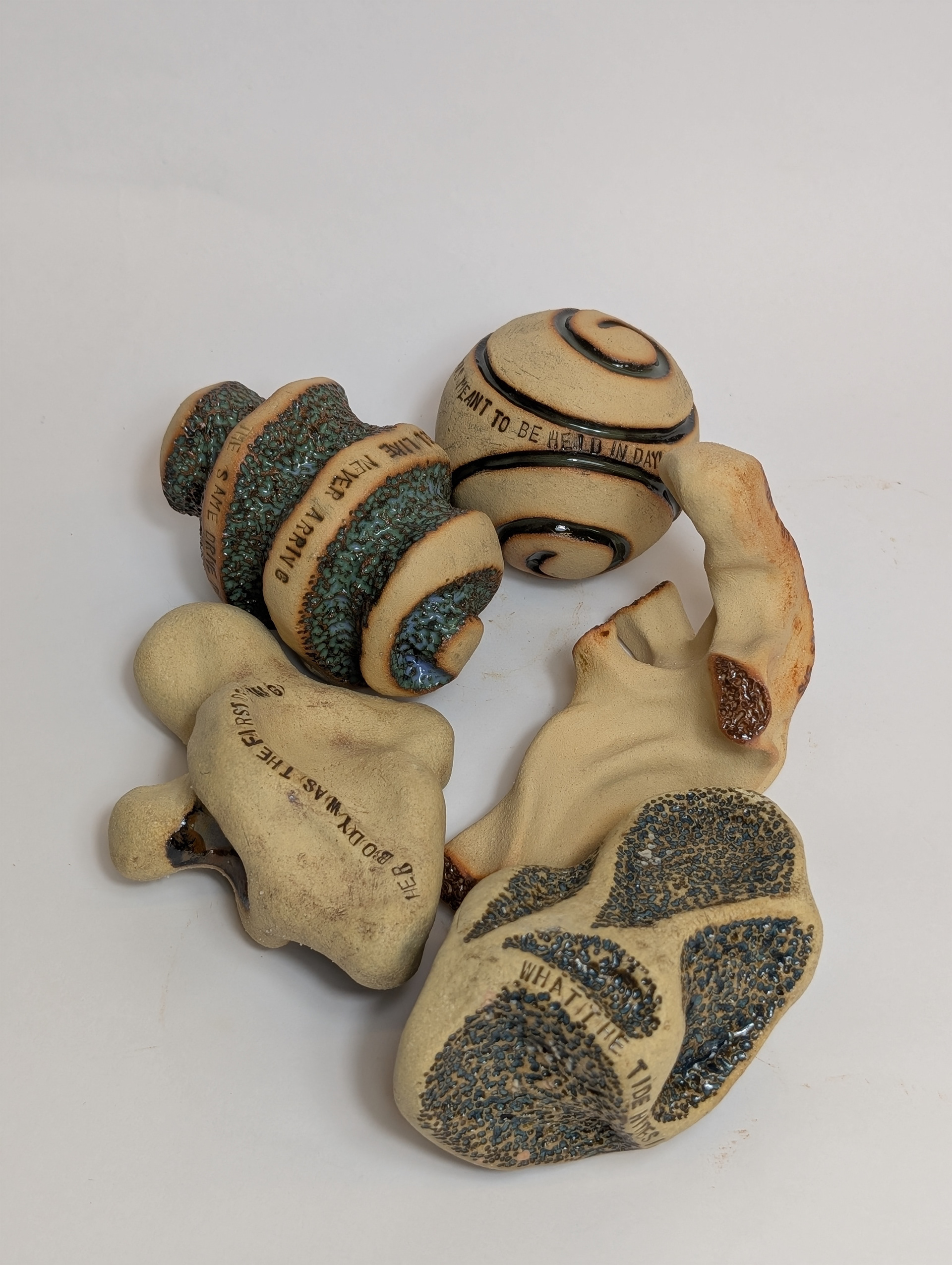 These ceramic works combine clay and language as interconnected forms of storytelling. Across small vessels and hand-held sculptural objects, text is stamped and embedded into the surface, following curves, joins, and interruptions in the form. The works are designed to be held and turned, allowing meaning to unfold through touch as well as reading. One series draws on coral forms observed in the Philippines, layering porous, organic structures with short poetic phrases drawn from personal experience. Another merges colonial bush poetry with English seasonal verse, recombining inherited texts to create new readings. Together, these works explore duality, movement, and borders, using clay and poetry to reflect on heritage, materiality, and post-colonial identity.