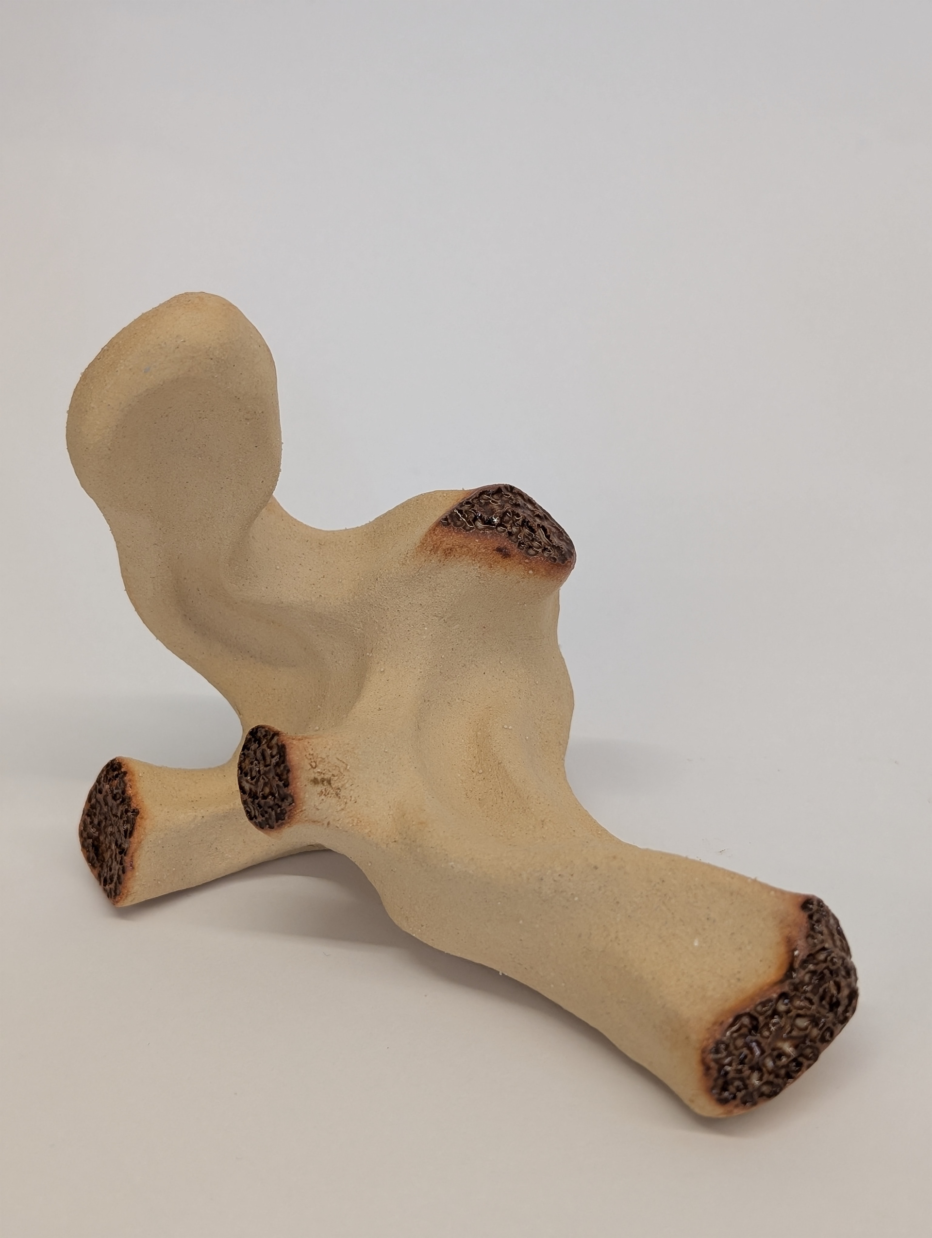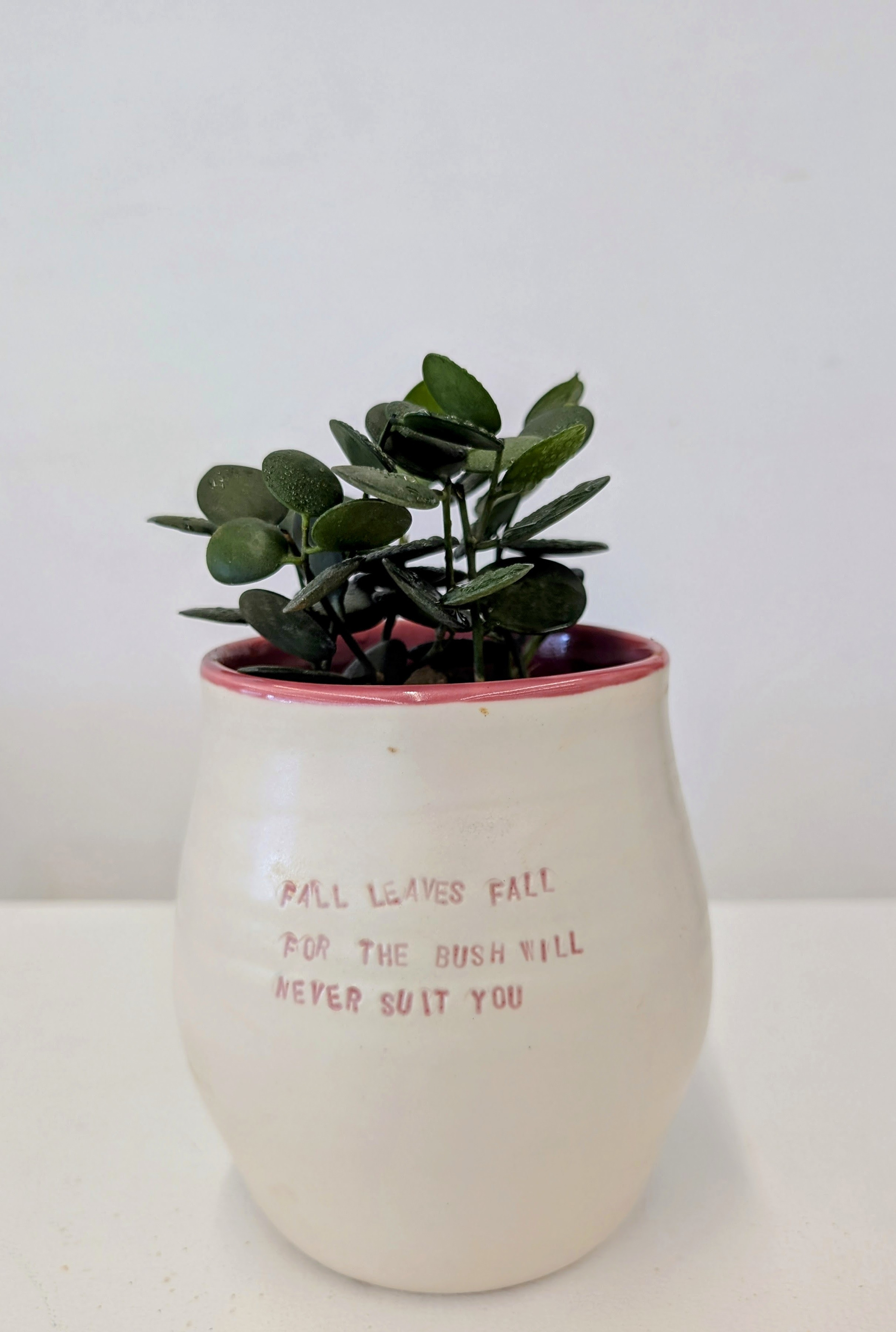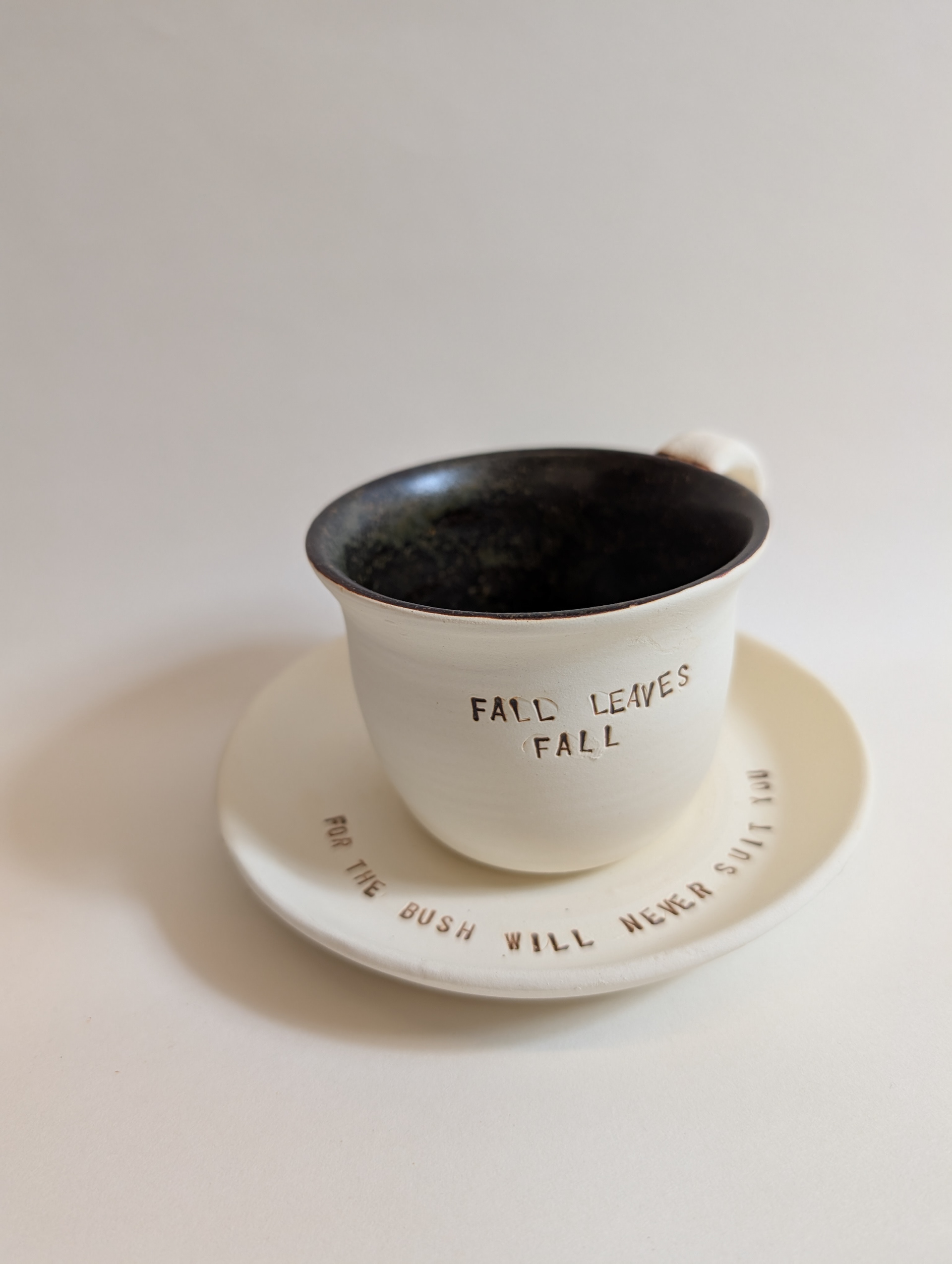 These ceramic works combine clay and language as interconnected forms of storytelling. Across small vessels and hand-held sculptural objects, text is stamped and embedded into the surface, following curves, joins, and interruptions in the form. The works are designed to be held and turned, allowing meaning to unfold through touch as well as reading. One series draws on coral forms observed in the Philippines, layering porous, organic structures with short poetic phrases drawn from personal experience. Another merges colonial bush poetry with English seasonal verse, recombining inherited texts to create new readings. Together, these works explore duality, movement, and borders, using clay and poetry to reflect on heritage, materiality, and post-colonial identity.