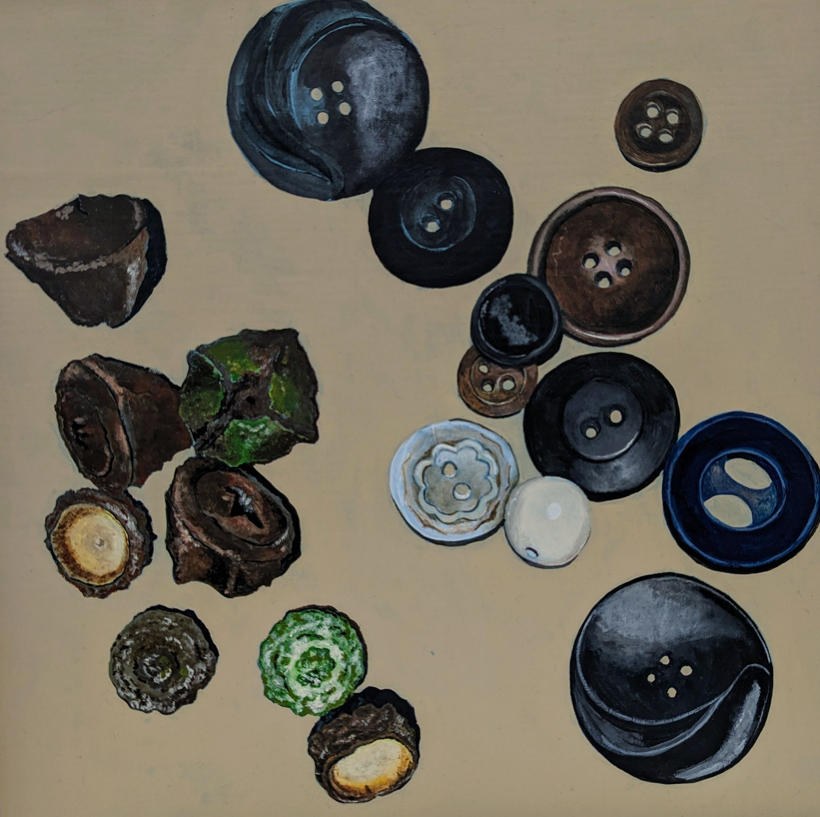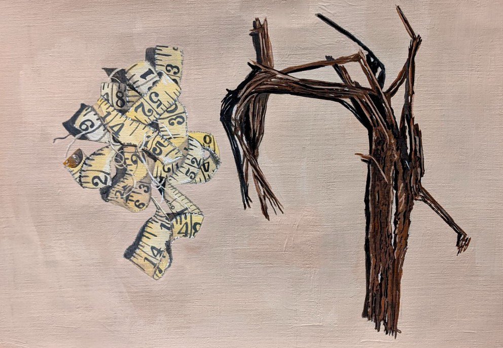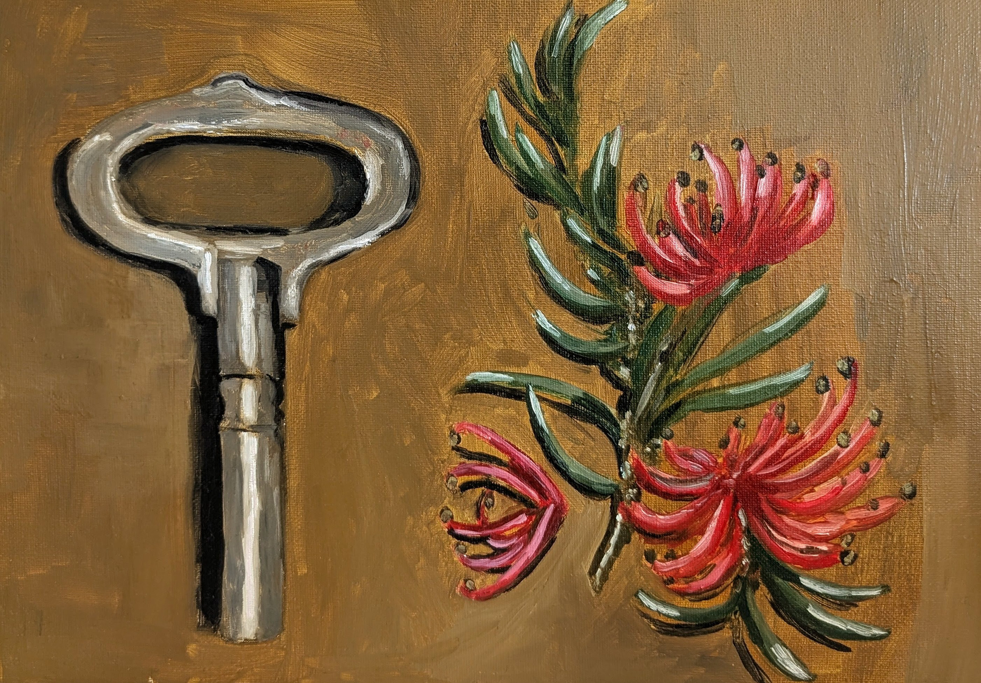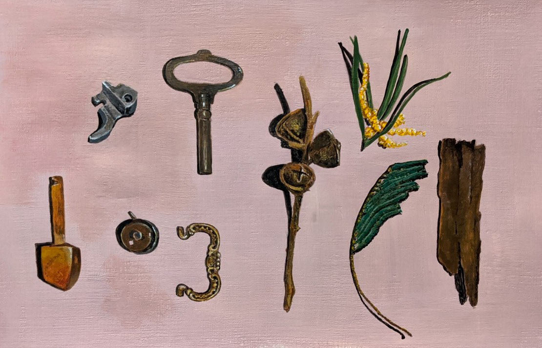 My paintings are largely still life, made through slow, attentive looking and a precise, almost hyper-real approach to detail. Small, carefully chosen objects become carriers of memory and history, often drawn from family heirlooms, particularly items connected to my great-grandmother, such as her Singer sewing machine, which functions as a time capsule. These domestic remnants are frequently juxtaposed with native flora and fauna, creating subtle conversations between colonial inheritance, ownership, migration, and place. Alongside these works sit self-portraits and patterned interiors, where the body, landscape, and decorative traditions intertwine, continuing an ongoing exploration of identity, belonging, and the traces we carry forward.